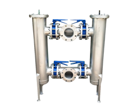 The system also contains a valve handle placed between the two baskets to divert the flow of liquid to one strainer while the other is being cleaned.